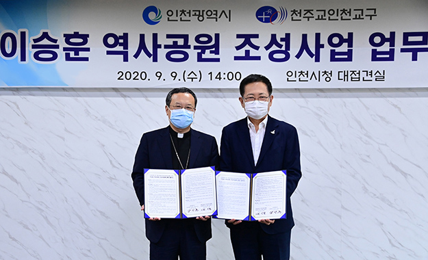 인천교구는 9월 9일 인천광역시(시장 박남춘)와 ‘이승훈 역사공원 조성사업’을 위한 업무협약을 체결했다. ‘이승훈 역사공원 조성사업’은 인천 남동구 장수동 산135번지 이승훈 묘역 일대 4만5792㎡ 부지에 역사공원과 천주교 역사문화체험관을 조성하는 내용을 골자로 한다.