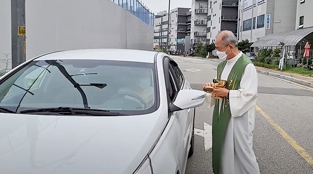 코로나19로 대면 미사가 중단된 상황에서 의정부교구 파주 목동동본당 주임 김오석 신부가 9월 6일 온라인 주일미사 후 성당 부지 앞에서 신자들에게 성체를 나눠주고 있다. 의정부교구 페이스북 갈무리