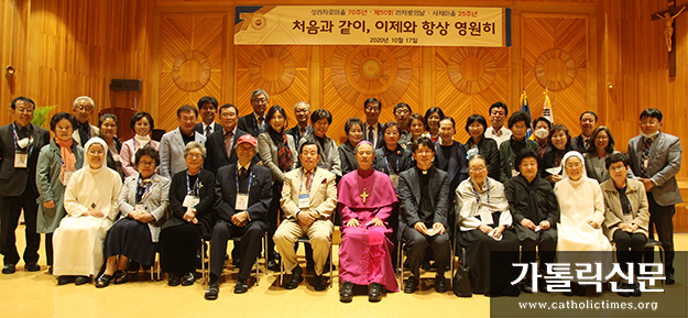 10월 17일 경기도 의왕시 성 라자로마을 아론의 집 대강당에서 열린 성 라자로마을 70주년 기념 제50회 라자로의 날 및 사제마을 25주년 기념식에서 수원교구장 이용훈 주교(앞줄 가운데)를 비롯한 참석자들이 기념사진을 찍고 있다.