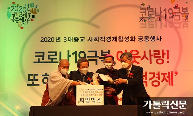 천주교와 개신교, 불교의 사회적기업 관련 단체들은 10월 22일 2020년 3대 종단 공동행사를 개최했다. ㈔예장사회적경제네트워크 주관으로 서울 종로구 한국교회 100주년 기념관에서 열린 이번 행사는 ‘코로나19 극복, 이웃사랑! 또 하나의 이름 ‘사회적경제’’라는 주제로 진행됐다. 행사에는 서울대교구 사회사목담당 교구장 대리 유경촌 주교, 대한예수교장로회 총회장 신정호 목사, 대한불교조계종 사회부장 성공 스님, 이재갑 고용노동부장관 등 50여 명이 참석했다.