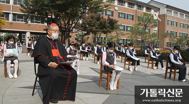 ACN 한국지부 이사장 염수정 추기경이 10월 22일 계성초등학교에서 학생들과 함께 묵주기도를 바치고 있다.