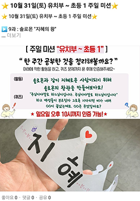 ‘놀면 뭐하니?’에 참여하는 방법은 간단하다. 학생들이 스마트폰 ‘카카오톡’에서 ‘화원성당 주일학교’ 채널을 검색해 친구로 추가하고, 메시지로 자신의 인적 사항을 전달한 뒤 채널에 업로드되는 미션을 수행하는 것이다. 미션은 주로 ▲교리 교재 공부 ▲미사 참례 ▲기도 ▲평일 미션(자기 세례명 그림 그리기 등) ▲돌발 미션(가정을 위한 기도 등) 으로 이뤄졌다.