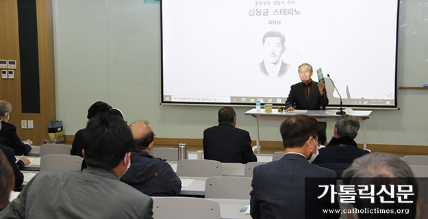 ‘춘천교구 평신도 추념의 날’을 기념해 11월 11일 강원도 춘천 가톨릭회관에서 열린 자랑스러운 신앙 선조 발표회에서 진용도 「철원성당 60년사」 편집위원장이 신동균 철원본당 초대 사목회장에 대해 설명하고 있다.