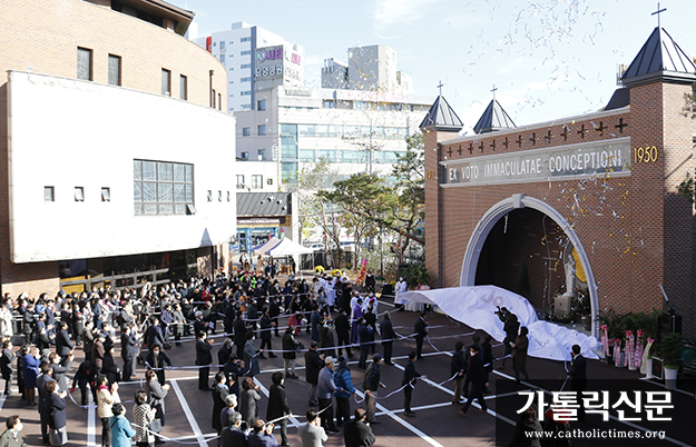 11월 29일 대구대교구 포항 죽도본당 70주년 기념 성모당 축복식에서 교구장 조환길 대주교와 주임 김도율 신부를 비롯한 신자들이 제막을 하고 있다.
