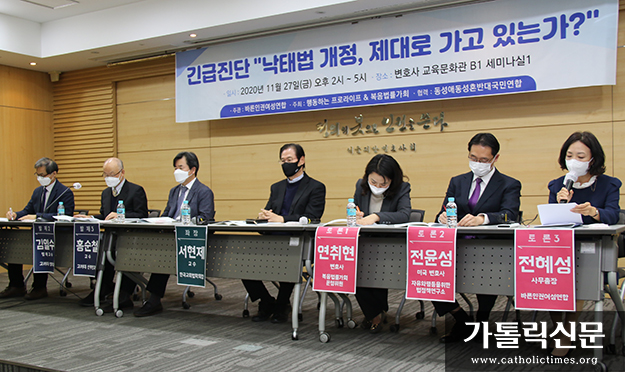 11월 27일 서울 서초구 서초동 변호사교육문화관에서 열린 긴급 진단 ‘낙태법 개정, 제대로 가고 있는가?’ 토론회에서 참가자들이 발언하고 있다.