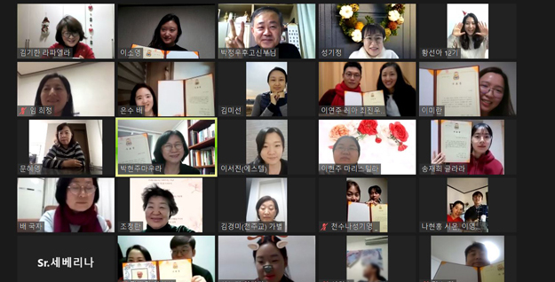 ‘슬기로운 부부생활을 위한 자연주기법 기초과정 교육’ 7기 수료생들이 12월 17일 오후 9시 온라인으로 진행된 수료식에서 수료증을 들고 기념 사진을 찍고 있다. 수료식 영상 갈무리