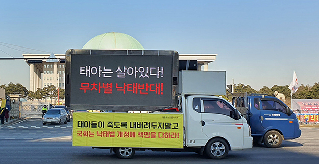 서울대교구 생명위원회 등 60여 개 생명수호 단체 연대체인 행동하는프로라이프가 12월 21일 서울 영등포 여의도동 국회의사당 주변에서 태아 생명 보호를 위한 올바른 낙태죄 관련 법 마련을 촉구하기 위해 차량을 이용한 캠페인을 진행하고 있다. 행동하는프로라이프 제공