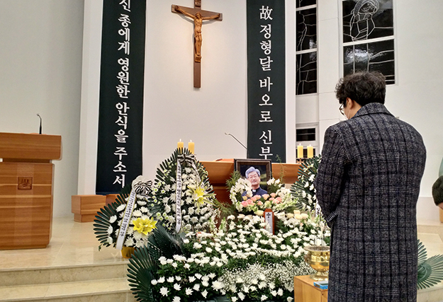 1월 18일 우리신학연구소 김항섭 이사장이 고(故) 정형달 신부 빈소에서 추모하고 있다. 우리신학연구소 제공