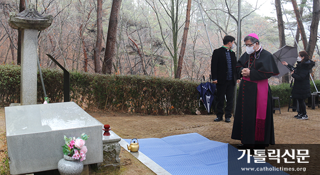 원주교구장 조규만 주교가 3월 1일 충북 제천 배론성지에서 열린 가경자 최양업 신부 탄생 200주년 기념 현양대회 중 최양업 신부 묘소에서 참배하고 있다.