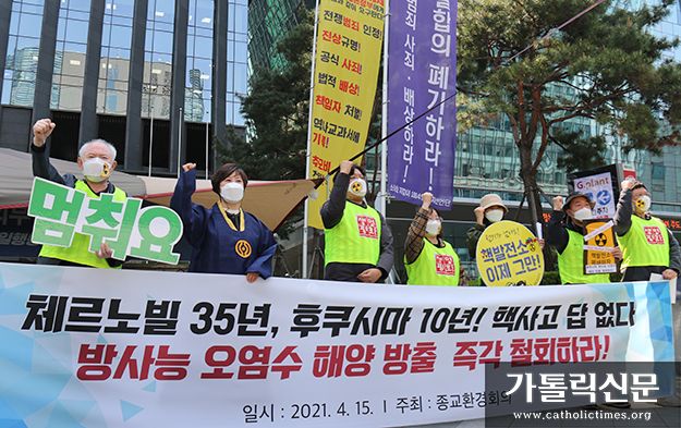 천주교창조보전연대를 비롯, 국내 주요 종교 환경운동단체들의 연합체인 종교환경회의는 15일 서울 종로구 옛 일본대사관 소녀상 앞에서 기자회견을 갖고 “모르타르 고체화 방법을 통해 해양 방류를 막을 수도 있었지만, 일본 정부는 값싸고 편리한 방법을 택했다”고 비난하면서 “지구 생명체 모두를 위협하는 후쿠시마 오염수 해양 방류 결정은 철회돼야 한다”고 주장했다.