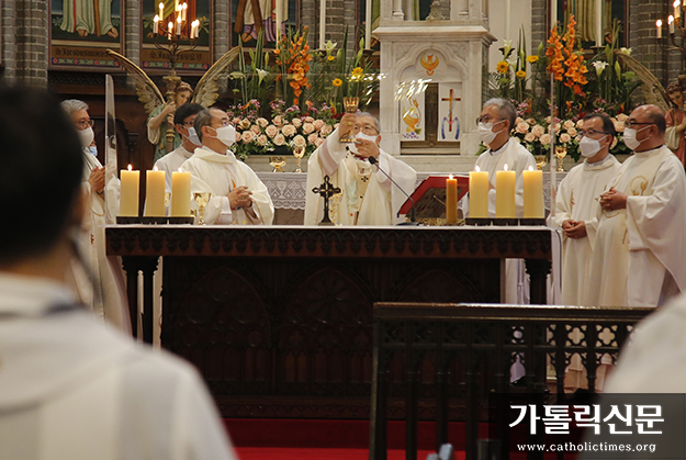 염수정 추기경이 사제 성화의 날을 맞아 6월 11일 서울 주교좌명동대성당에서 미사를 주례하고 있다. 사진 성슬기 기자