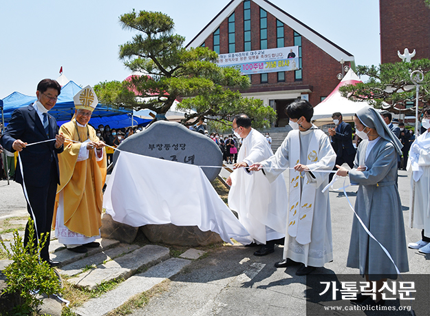 대전교구 논산 부창동본당 설립 100주년을 맞아 6월 20일 교구장 유흥식 대주교(왼쪽 두 번째)와 주임 곽명호 신부(가운데) 등이 100주년 기념석을 제막하고 있다. 대전교구 홍보국 제공