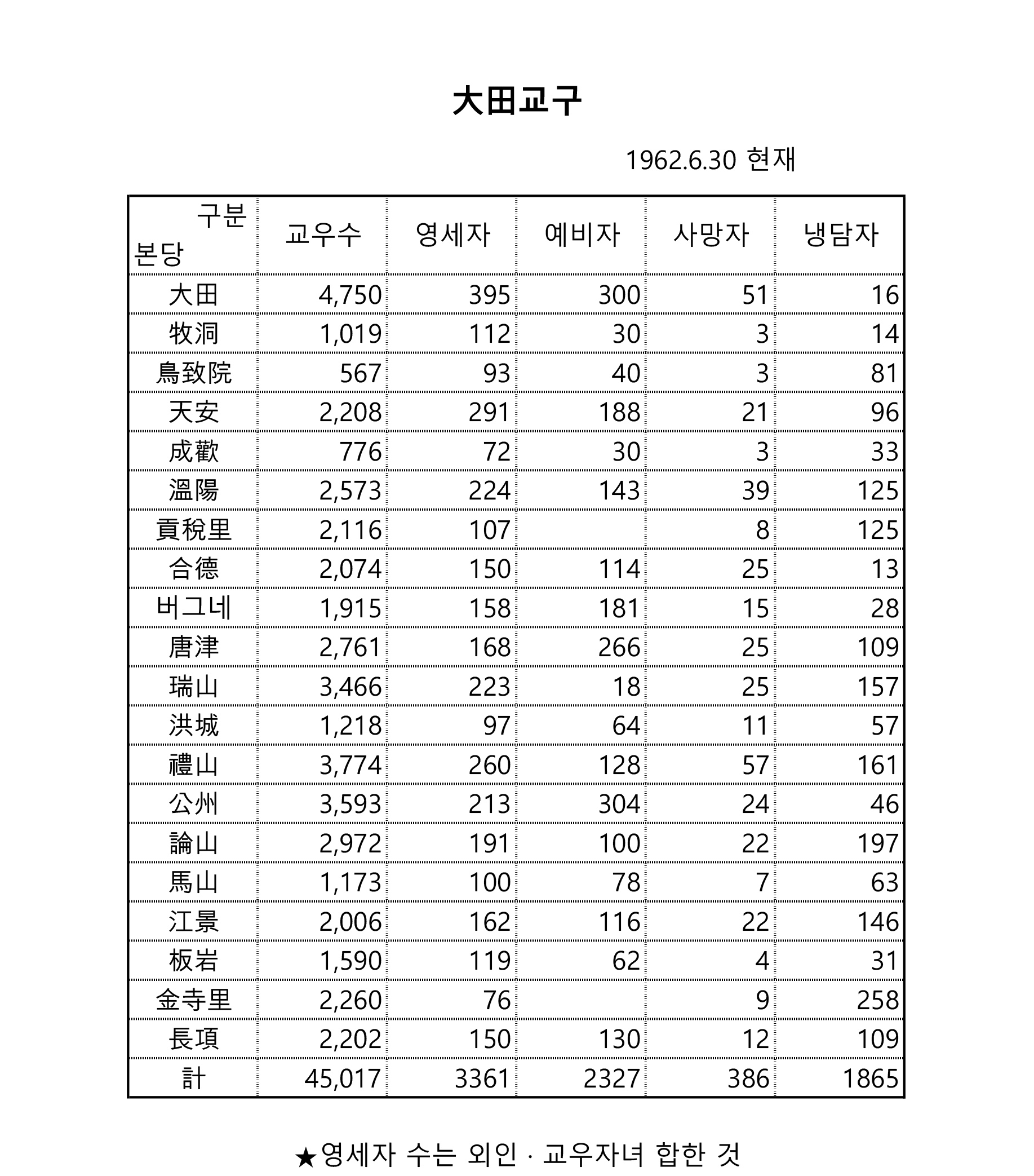 냉담자도 다시 282명이 늘어 1,865명이나 된다. 사망자도 41명이 증가해서 386명이다. 예비자는 494명이 줄어 2,327명이 됐다.