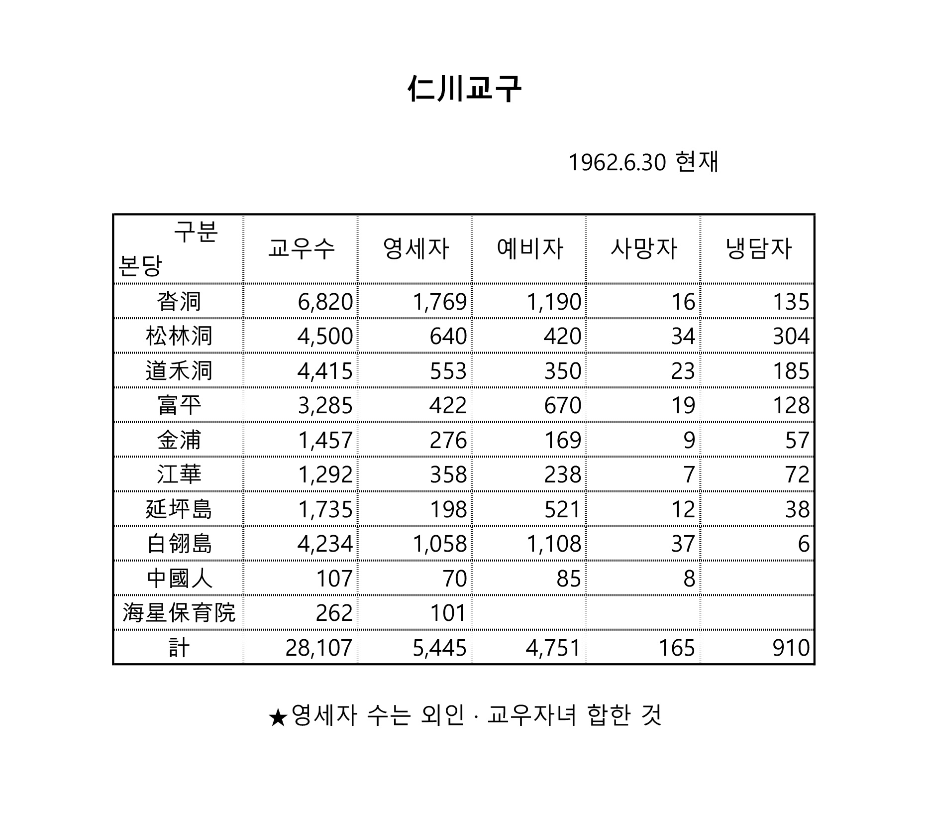 數字上(수자상)으로 본 今年敎勢(금년교세) ② 仁川敎區(인천교구) · 大田敎區(대전교구)