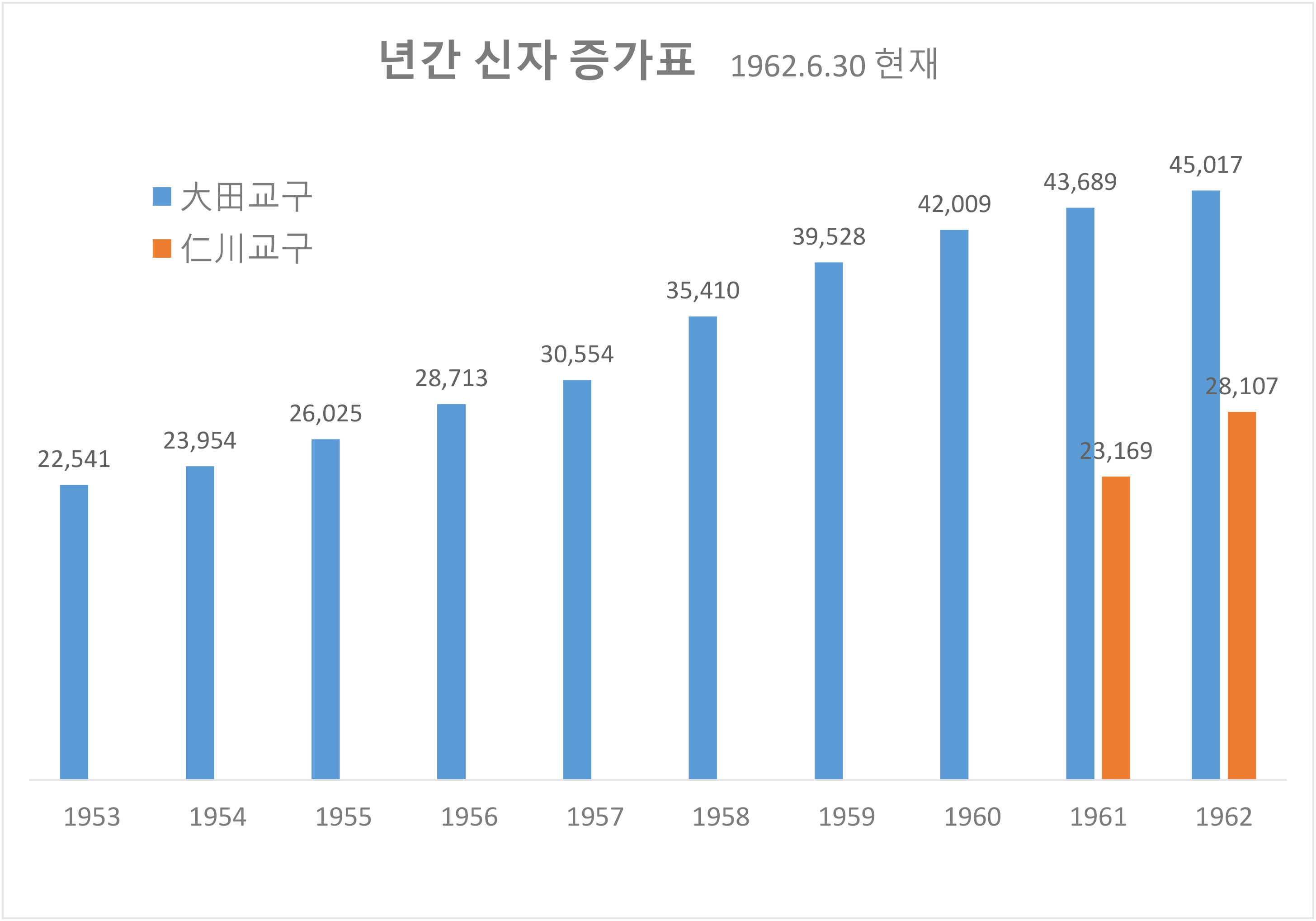 별항도표와 같이 교세는 10년전인 1953년의 약2배의 숫자로 증가했다.