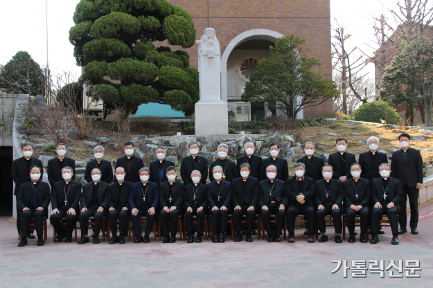 주교회의 2022년 춘계 정기총회에 참석한 주교단이 3월 22일 서울 중곡동 한국천주교중앙협의회 앞에서 기념사진을 찍고 있다. 사진 이소영 기자