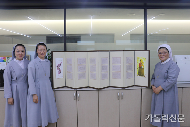 한국 천주교 여자수도회 장상연합회 민족화해분과위원회 김유나·진일우·이선중 수녀(왼쪽부터)가 프란치스코 교황에게 보내는 편지 앞에서 기념사진을 찍고 있다.