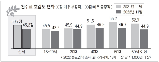 여론조사기관 ㈜한국리서치가 실시한 ‘2022 종교인식조사’에서 천주교에 대한 호감도가 지난해 50.7점에서 올해 45.2점으로 소폭 하락했다.
