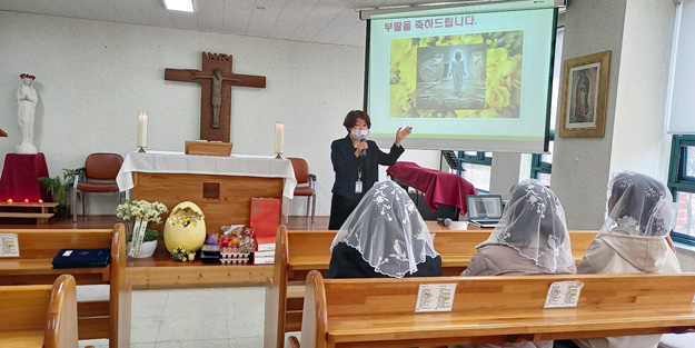 4월 9일 하나원 안성 본원에서 공소 예절에 앞서 민족화해위원회 관계자가 북한이탈주민들과 성가 연습을 하고 있다. 민족화해위원회 제공